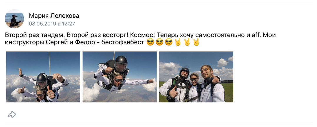 Мы предлагаем взрыв эмоций и добрую порцию адреналина в одной подарочной коробке – это первый прыжок с парашютом. Ощутить невероятный восторг от свободного полета в течение одной минуты с высоты чуть больше четырех километров (это пять башен Бурдж Халифа – самого высокого здания в мире). Сделать это можно самостоятельно, не имея особых навыков. Достаточно лишь записаться на нашем сайте или позвонить по телефону и оставить заявку на прыжок в тандеме.