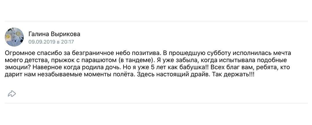 Прыжок с парашютом занимает около часа, но рассчитывайте выделить на это событие весь день, так как на нашу работу влияют погодные условия и сложная специфика авиационной деятельности.